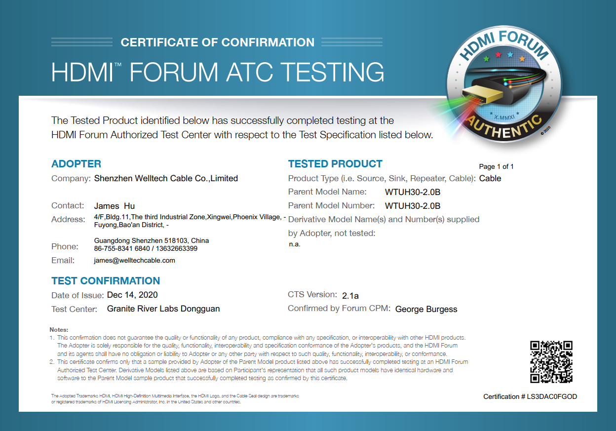 1m ULTRA HDMI Cable Certificate